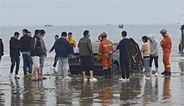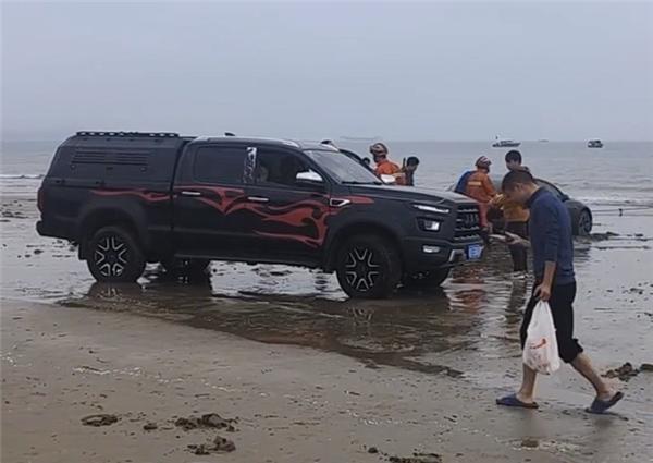 现场情况一度非常紧张,消防队员赶到现场,但面对这种特殊的陷车情况,他们也无能为力。热心的群众纷纷伸出援手,有人开来了坦克300越野车,还有人找来了江淮皮卡,试图帮忙拖车。但由于Model 3陷车的位置离海水太近,加上缺乏专业的救援设备,这些尝试都未能成功。